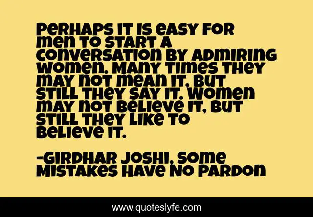 This page presents the quote "Perhaps it is easy for men to start a conversation by admiring women. Many times they may not mean it, but still they say it. Women may not believe it, but still they like to believe it.". Author of this quote is Girdhar Joshi, Some Mistakes Have No Pardon. .
