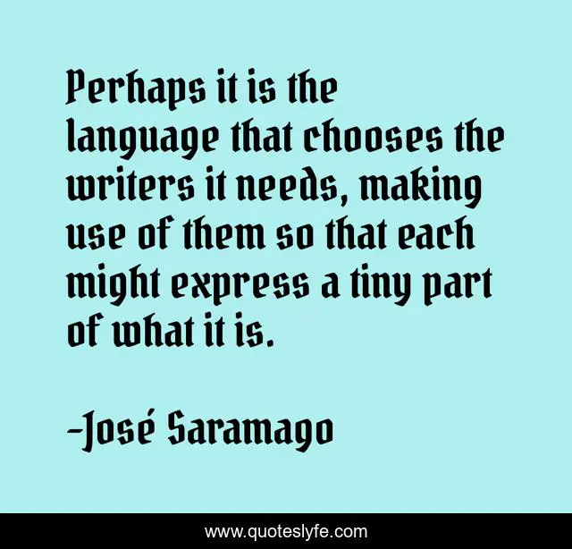 This page presents the quote "Perhaps it is the language that chooses the writers it needs, making use of them so that each might express a tiny part of what it is.". Author of this quote is José Saramago. This quote is about language, writing,.