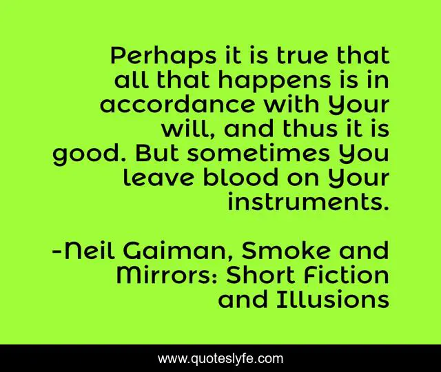 This page presents the quote "Perhaps it is true that all that happens is in accordance with Your will, and thus it is good. But sometimes You leave blood on Your instruments.". Author of this quote is Neil Gaiman, Smoke and Mirrors: Short Fiction and Illusions. This quote is about god, murder, angels, murder-mysteries,.
