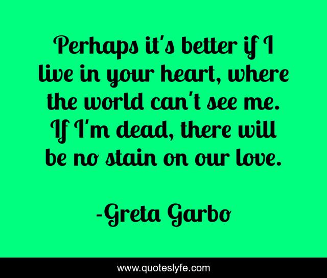 This page presents the quote "Perhaps it's better if I live in your heart, where the world can't see me. If I'm dead, there will be no stain on our love.". Author of this quote is Greta Garbo. This quote is about camille, death, love, affection,.