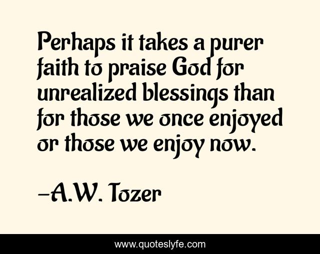 This page presents the quote "Perhaps it takes a purer faith to praise God for unrealized blessings than for those we once enjoyed or those we enjoy now.". Author of this quote is A.W. Tozer. This quote is about thankfulness, faith, life, virtue, hope,.