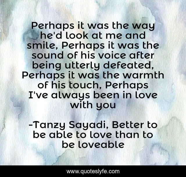 This page presents the quote "Perhaps it was the way he'd look at me and smile, Perhaps it was the sound of his voice after being utterly defeated, Perhaps it was the warmth of his touch, Perhaps I've always been in love with you". Author of this quote is Tanzy Sayadi, Better to be able to love than to be loveable. This quote is about poem, love, poetry, affection, defeat, touch, smile, warmth, happiness,.