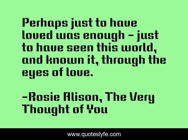 This page presents the quote "Perhaps just to have loved was enough - just to have seen this world, and known it, through the eyes of love.". Author of this quote is Rosie Alison, The Very Thought of You. This quote is about world, love, affection, inspiration,.