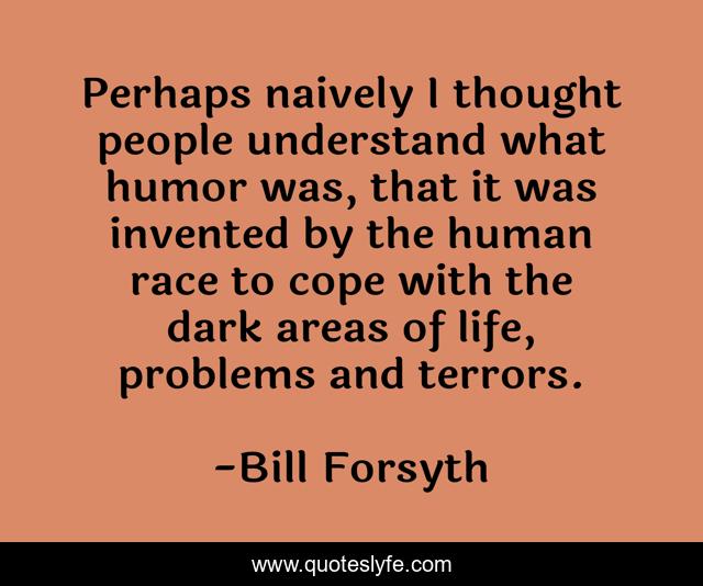 This page presents the quote "Perhaps naively I thought people understand what humor was, that it was invented by the human race to cope with the dark areas of life, problems and terrors.". Author of this quote is Bill Forsyth. This quote is about dark, life, problems,.