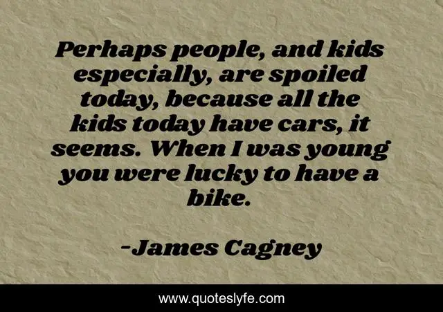 This page presents the quote "Perhaps people, and kids especially, are spoiled today, because all the kids today have cars, it seems. When I was young you were lucky to have a bike.". Author of this quote is James Cagney. This quote is about bike, today, people,.