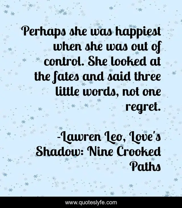 This page presents the quote "Perhaps she was happiest when she was out of control. She looked at the fates and said three little words, not one regret.". Author of this quote is Lawren Leo, Love's Shadow: Nine Crooked Paths. This quote is about control, love, destiny, fate, fates, affection, regret,.