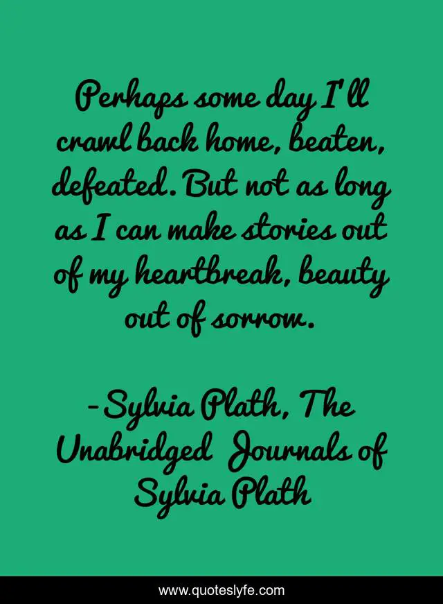 This page presents the quote "Perhaps some day I'll crawl back home, beaten, defeated. But not as long as I can make stories out of my heartbreak, beauty out of sorrow.". Author of this quote is Sylvia Plath, The Unabridged Journals of Sylvia Plath. This quote is about stories, sylvia-plath,.