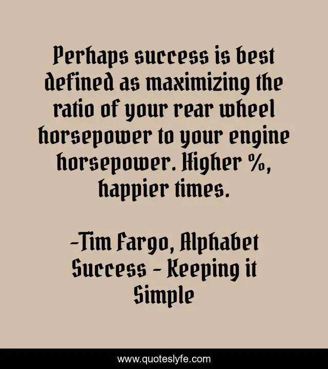 This page presents the quote "Perhaps success is best defined as maximizing the ratio of your rear wheel horsepower to your engine horsepower. Higher %, happier times.". Author of this quote is Tim Fargo, Alphabet Success - Keeping it Simple. This quote is about simplicity, potential, success,.