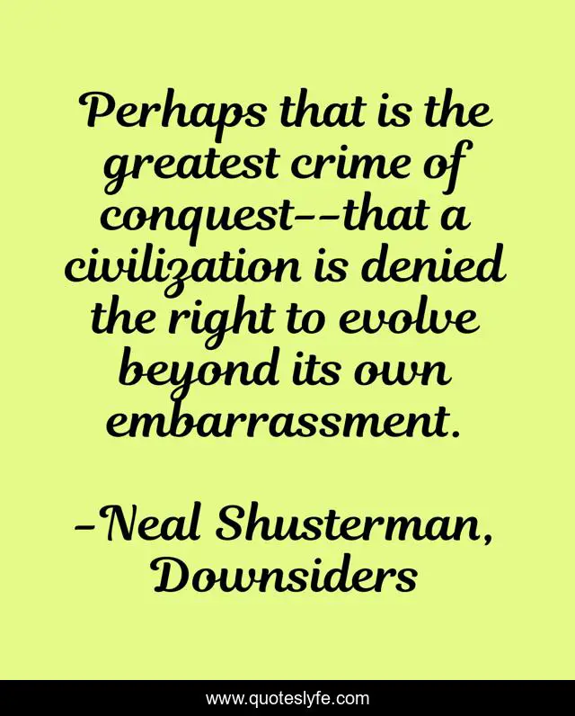 This page presents the quote "Perhaps that is the greatest crime of conquest--that a civilization is denied the right to evolve beyond its own embarrassment.". Author of this quote is Neal Shusterman, Downsiders. This quote is about conquest, history, national-identity, nations,.