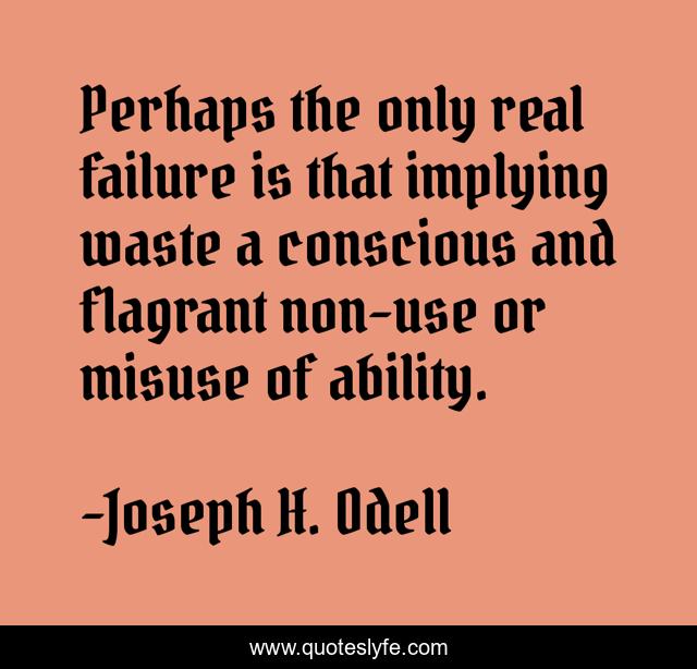 This page presents the quote "Perhaps the only real failure is that implying waste a conscious and flagrant non-use or misuse of ability.". Author of this quote is Joseph H. Odell. This quote is about failures, mistakes,.