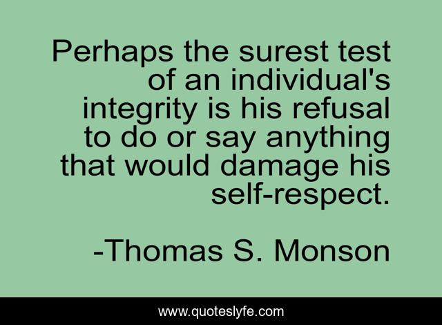 This page presents the quote "Perhaps the surest test of an individual's integrity is his refusal to do or say anything that would damage his self-respect.". Author of this quote is Thomas S. Monson. This quote is about self-respect, integrity,.