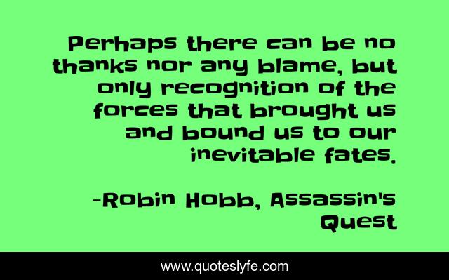 This page presents the quote "Perhaps there can be no thanks nor any blame, but only recognition of the forces that brought us and bound us to our inevitable fates.". Author of this quote is Robin Hobb, Assassin's Quest. This quote is about apologies, blame, fate,.