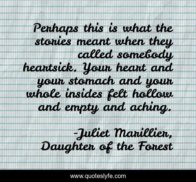 This page presents the quote "Perhaps this is what the stories meant when they called somebody heartsick. Your heart and your stomach and your whole insides felt hollow and empty and aching.". Author of this quote is Juliet Marillier, Daughter of the Forest. .