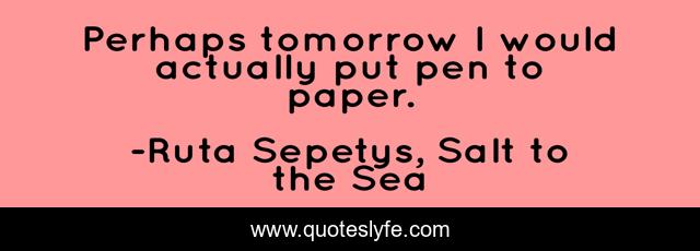 This page presents the quote "Perhaps tomorrow I would actually put pen to paper.". Author of this quote is Ruta Sepetys, Salt to the Sea. This quote is about write, salt-to-the-sea, books, writing,.