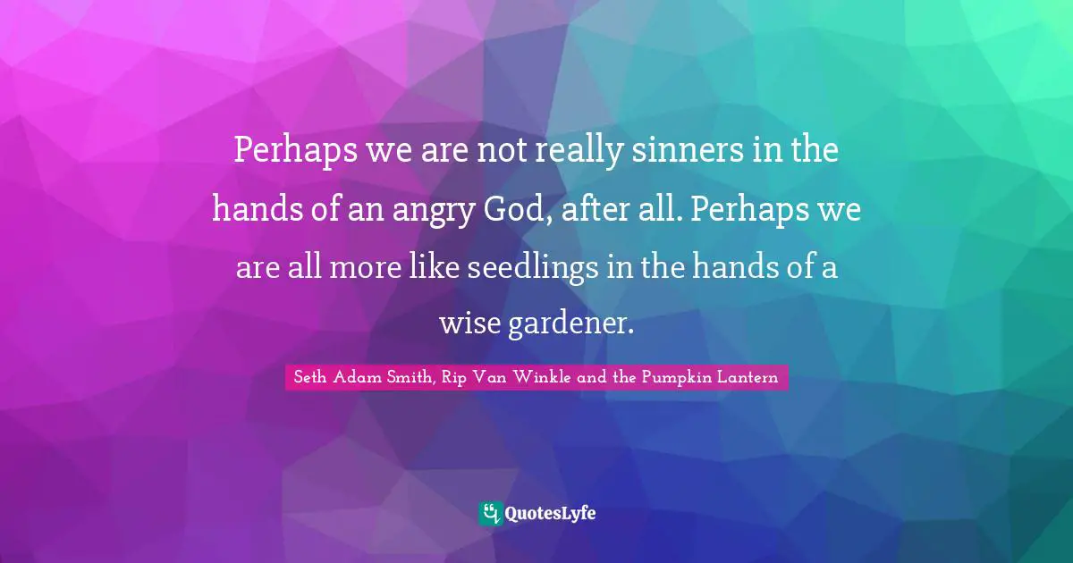 This page presents the quote "Perhaps we are not really sinners in the hands of an angry God, after all. Perhaps we are all more like seedlings in the hands of a wise gardener.". Author of this quote is Seth Adam Smith, Rip Van Winkle and the Pumpkin Lantern. This quote is about gardening, god, loving-god, wise, seedlings, hands-of-an-angry-god, gardener, sinners,.