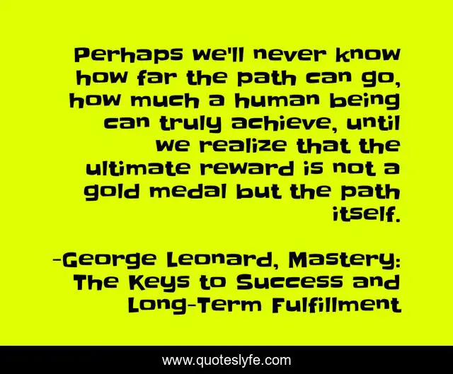 This page presents the quote "Perhaps we'll never know how far the path can go, how much a human being can truly achieve, until we realize that the ultimate reward is not a gold medal but the path itself.". Author of this quote is George Leonard, Mastery: The Keys to Success and Long-Term Fulfillment. This quote is about mastery, life, the-path, perfectionism, achievement,.