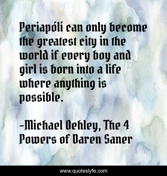 This page presents the quote "Periapólí can only become the greatest city in the world if every boy and girl is born into a life where anything is possible.". Author of this quote is Michael Oehley, The 4 Powers of Daren Saner. This quote is about equal-rights, equality, freedom,.