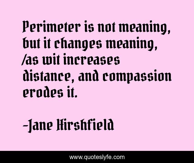 This page presents the quote "Perimeter is not meaning, but it changes meaning, /as wit increases distance, and compassion erodes it.". Author of this quote is Jane Hirshfield. .