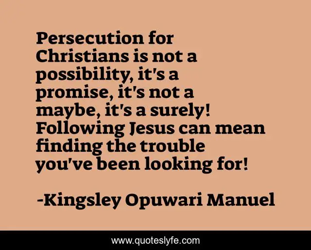 This page presents the quote "Persecution for Christians is not a possibility, it's a promise, it's not a maybe, it's a surely! Following Jesus can mean finding the trouble you've been looking for!". Author of this quote is Kingsley Opuwari Manuel. This quote is about spiritual, discipleship, missions, following-jesus, church, persecution, christianity, sermons, persecution-of-christians,.