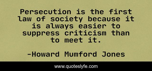 This page presents the quote "Persecution is the first law of society because it is always easier to suppress criticism than to meet it.". Author of this quote is Howard Mumford Jones. This quote is about criticism, law, first,.