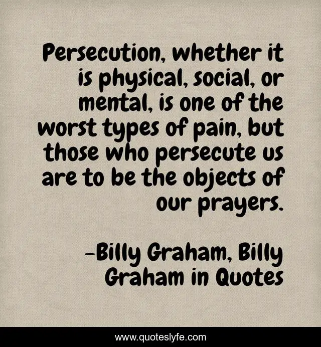 This page presents the quote "Persecution, whether it is physical, social, or mental, is one of the worst types of pain, but those who persecute us are to be the objects of our prayers.". Author of this quote is Billy Graham, Billy Graham in Quotes. This quote is about billy-graham, prayer,.