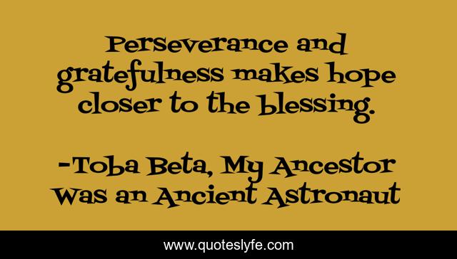 This page presents the quote "Perseverance and gratefulness makes hope closer to the blessing.". Author of this quote is Toba Beta, My Ancestor Was an Ancient Astronaut. This quote is about perseverance, blessing, hope, gratefulness,.