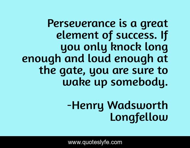 This page presents the quote "Perseverance is a great element of success. If you only knock long enough and loud enough at the gate, you are sure to wake up somebody.". Author of this quote is Henry Wadsworth Longfellow. This quote is about perseverance, success, long,.
