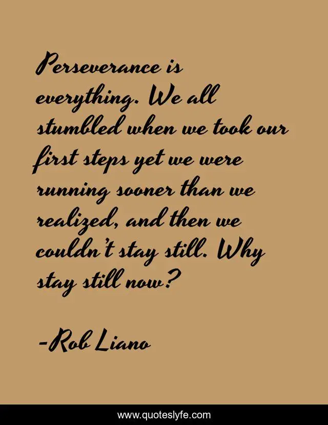 This page presents the quote "Perseverance is everything. We all stumbled when we took our first steps yet we were running sooner than we realized, and then we couldn’t stay still. Why stay still now?". Author of this quote is Rob Liano. This quote is about encouragement, perseverance, obstacles, commitment, learning,.
