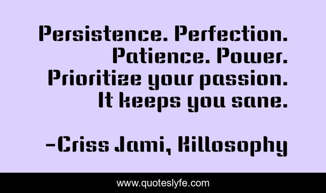 "Criss Jami, Killosophy Quotes." Quoteslyfe.com, 2025. Fri. 05 Dec. 2025. <https://www.quoteslyfe.com/quote/Persistence-Perfection-Patience-Power-Prioritize-your-passion-25604>.