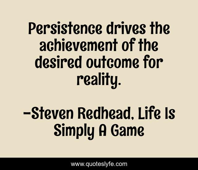 This page presents the quote "Persistence drives the achievement of the desired outcome for reality.". Author of this quote is Steven Redhead, Life Is Simply A Game. This quote is about desired, outcome, achievement, persistence, reality,.