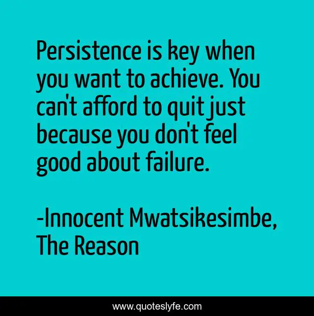 This page presents the quote "Persistence is key when you want to achieve. You can't afford to quit just because you don't feel good about failure.". Author of this quote is Innocent Mwatsikesimbe, The Reason. This quote is about confidence, success, positive, motivational, failure, self-improvement, inspirational, self-help, enthusiasm,.