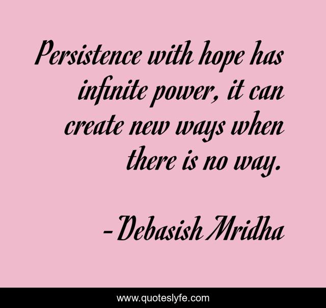 This page presents the quote "Persistence with hope has infinite power, it can create new ways when there is no way.". Author of this quote is Debasish Mridha. This quote is about life, love, knowledge, inspirational, intelligence, philosophy, wisdom, quotes, affection,.