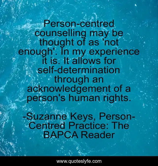 This page presents the quote "Person-centred counselling may be thought of as 'not enough'. In my experience it is. It allows for self-determination through an acknowledgement of a person's human rights.". Author of this quote is Suzanne Keys, Person-Centred Practice: The BAPCA Reader. This quote is about person-centred, autonomy, self-determination, human-rights-empowerment,.