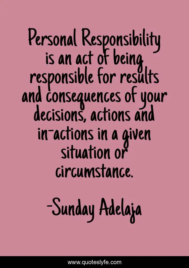 This page presents the quote "Personal Responsibility is an act of being responsible for results and consequences of your decisions, actions and in-actions in a given situation or circumstance.". Author of this quote is Sunday Adelaja. This quote is about responsibile, personal, comsequence, results, actions, circumstance, decisions, in-action,.