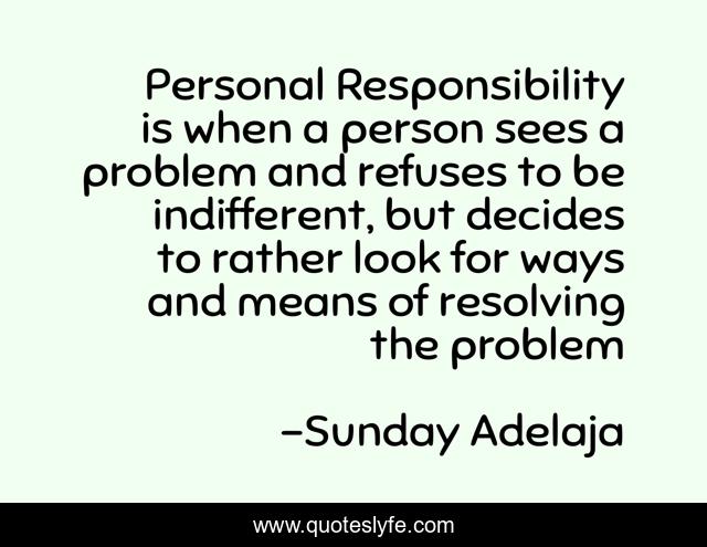 This page presents the quote "Personal Responsibility is when a person sees a problem and refuses to be indifferent, but decides to rather look for ways and means of resolving the problem". Author of this quote is Sunday Adelaja. This quote is about rather, decides, look, ways, resolving, personal, responsibility, sees, problem,.