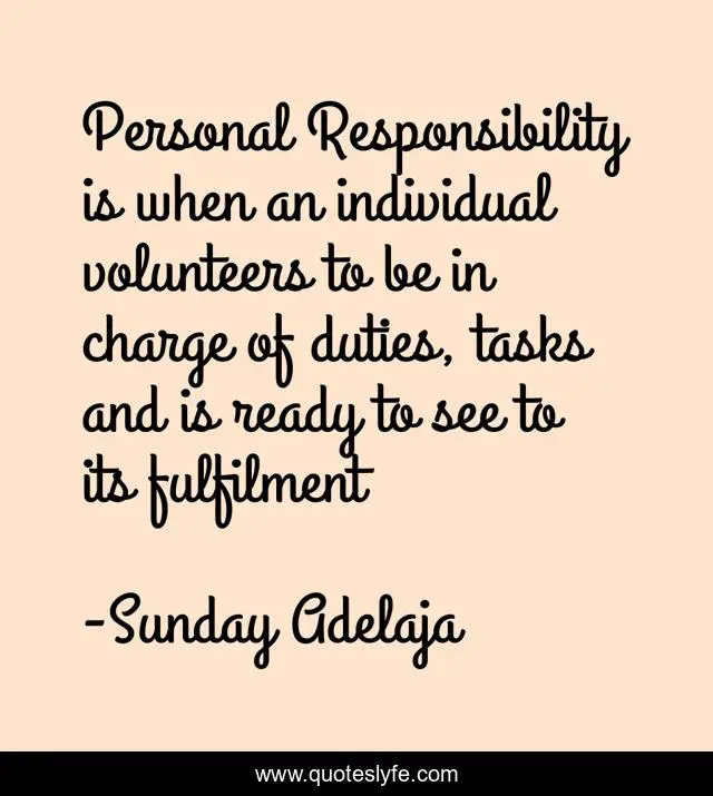This page presents the quote "Personal Responsibility is when an individual volunteers to be in charge of duties, tasks and is ready to see to its fulfilment". Author of this quote is Sunday Adelaja. This quote is about tasks, personal, fulfilment, charge, responsibility, ready, volunteers, duties,.