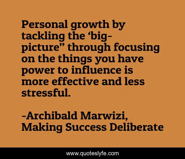 This page presents the quote "Personal growth by tackling the ‘big-picture” through focusing on the things you have power to influence is more effective and less stressful.". Author of this quote is Archibald Marwizi, Making Success Deliberate. This quote is about life, success, behaviour, attitude, legacy, growth, purpose, inspirational, leadership,.
