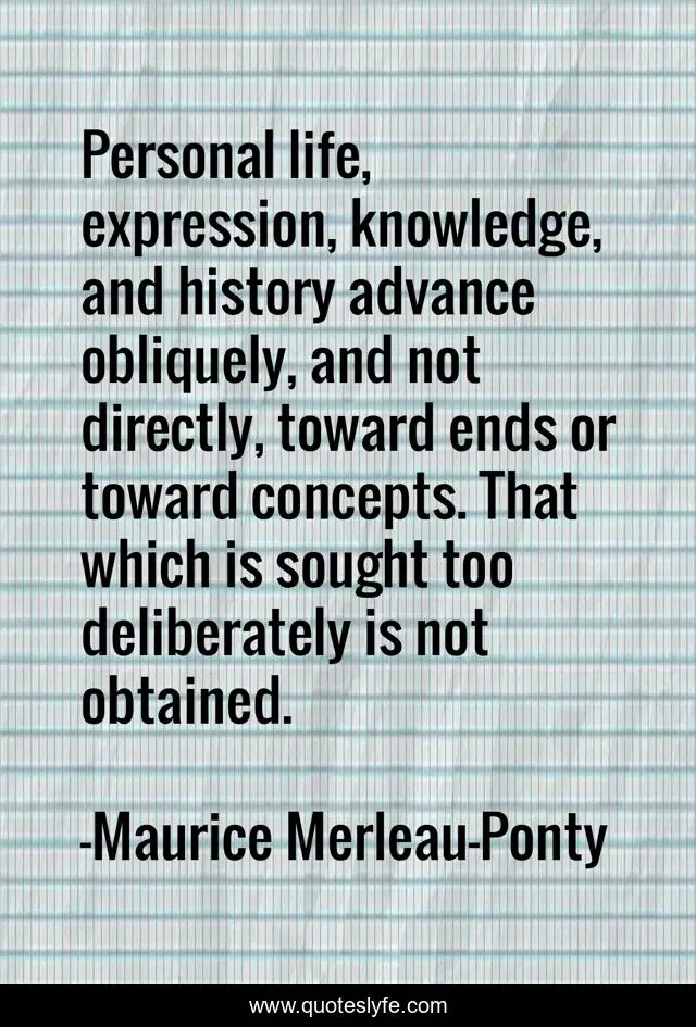 This page presents the quote "Personal life, expression, knowledge, and history advance obliquely, and not directly, toward ends or toward concepts. That which is sought too deliberately is not obtained.". Author of this quote is Maurice Merleau-Ponty. This quote is about knowledge, oblique, circumlocution, personal-life, subterfuge, expression, history,.