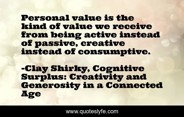 This page presents the quote "Personal value is the kind of value we receive from being active instead of passive, creative instead of consumptive.". Author of this quote is Clay Shirky, Cognitive Surplus: Creativity and Generosity in a Connected Age. This quote is about community, creative, new-media, value, personal-value, technology,.
