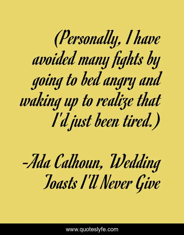 This page presents the quote "(Personally, I have avoided many fights by going to bed angry and waking up to realize that I'd just been tired.)". Author of this quote is Ada Calhoun, Wedding Toasts I'll Never Give. This quote is about arguing, going-to-bed-angry, marriage,.