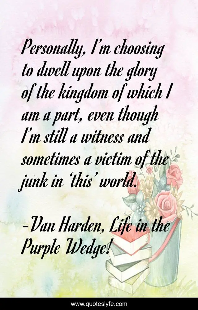 This page presents the quote "Personally, I’m choosing to dwell upon the glory of the kingdom of which I am a part, even though I’m still a witness and sometimes a victim of the junk in ‘this’ world.". Author of this quote is Van Harden, Life in the Purple Wedge!. This quote is about kingdom-of-god, focus, glory-in-death, perspective,.