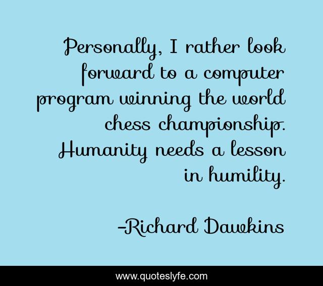 This page presents the quote "Personally, I rather look forward to a computer program winning the world chess championship. Humanity needs a lesson in humility.". Author of this quote is Richard Dawkins. This quote is about world, humanity, winning,.