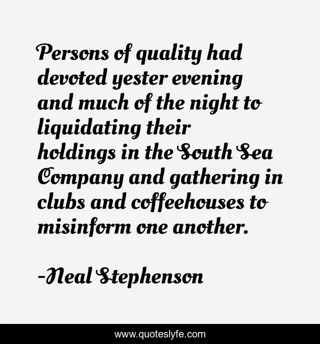 This page presents the quote "Persons of quality had devoted yester evening and much of the night to liquidating their holdings in the South Sea Company and gathering in clubs and coffeehouses to misinform one another.". Author of this quote is Neal Stephenson. This quote is about gossip, coffeeshop, humor, coffee-shop,.