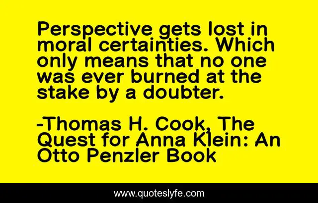 This page presents the quote "Perspective gets lost in moral certainties. Which only means that no one was ever burned at the stake by a doubter.". Author of this quote is Thomas H. Cook, The Quest for Anna Klein: An Otto Penzler Book. This quote is about perspective, morality,.