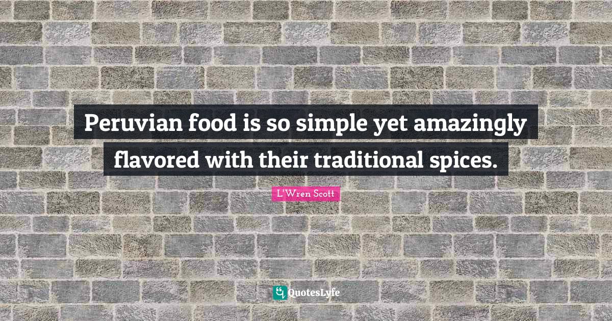This page presents the quote "Peruvian food is so simple yet amazingly flavored with their traditional spices.". Author of this quote is L'Wren Scott. This quote is about simple, traditional, spices,.