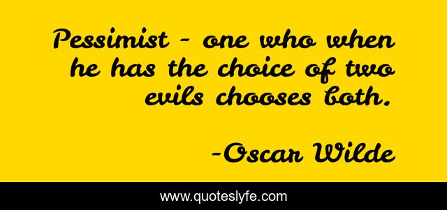 This page presents the quote "Pessimist - one who when he has the choice of two evils chooses both.". Author of this quote is Oscar Wilde. This quote is about pessimism, optimism,.