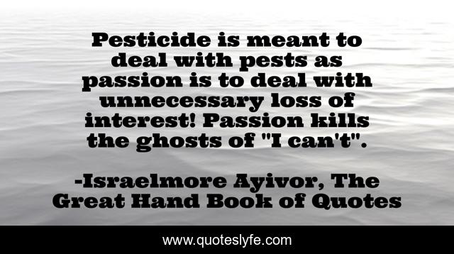 This page presents the quote "Pesticide is meant to deal with pests as passion is to deal with unnecessary loss of interest! Passion kills the ghosts of "I can't".". Author of this quote is Israelmore Ayivor, The Great Hand Book of Quotes. This quote is about deal, i-can-t, unnecessary, passion, kill, food-for-thought, pests, interested, loss-of-interest,.