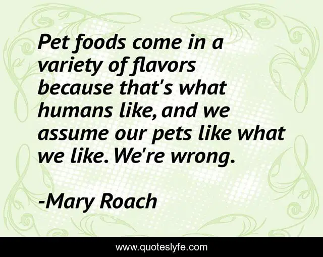 This page presents the quote "Pet foods come in a variety of flavors because that's what humans like, and we assume our pets like what we like. We're wrong.". Author of this quote is Mary Roach. This quote is about assume, like, variety,.