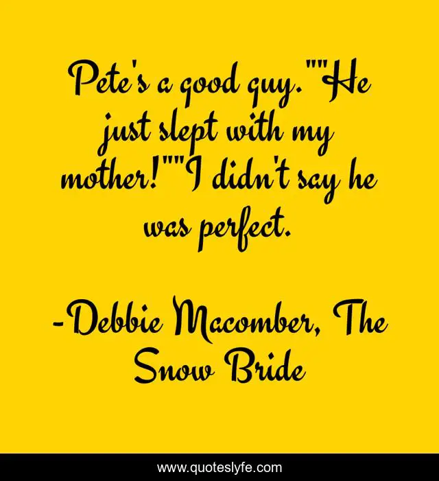 This page presents the quote "Pete's a good guy.""He just slept with my mother!""I didn't say he was perfect.". Author of this quote is Debbie Macomber, The Snow Bride. This quote is about contemporary-romance, snow, alaska,.