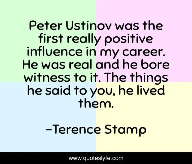 This page presents the quote "Peter Ustinov was the first really positive influence in my career. He was real and he bore witness to it. The things he said to you, he lived them.". Author of this quote is Terence Stamp. This quote is about career, influence,.